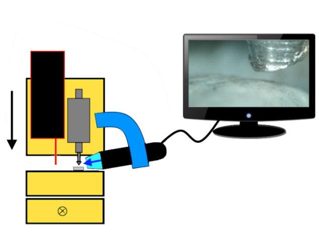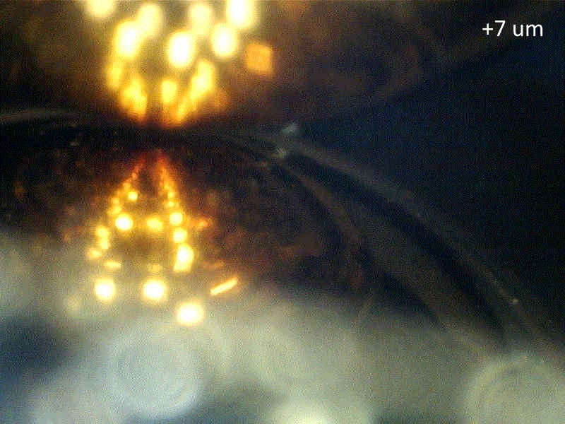 The upper hemispherical contact is lowered towards a thin film planar contact. The contact surfaces have a highly reflective surface which reflects the image of the upper contact and the microscope light source.