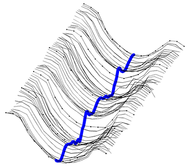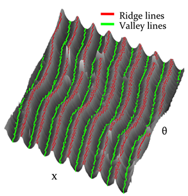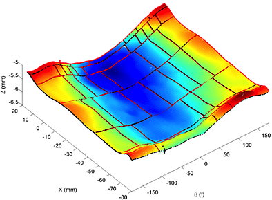 Once individual segments of the surface have been recorded it is necessary to mathematically piece together the sections. The overall form of the measurement is largely irrelevant as it does not constitute audio information so this is also mathematically removed. The remaining data consist of the individual grooves in the surface. By tracking the minima of the grooves the path the stylus would have followed can be extrapolated.